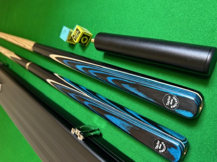 Taylor made english 8 ball pool cue package deal, includes both playing cue and break cue plus a lovely wide black aluminium cue case with chrome ends and slimline design looks fantastic. The set also comes complete with 6" mini butt and two chalks.