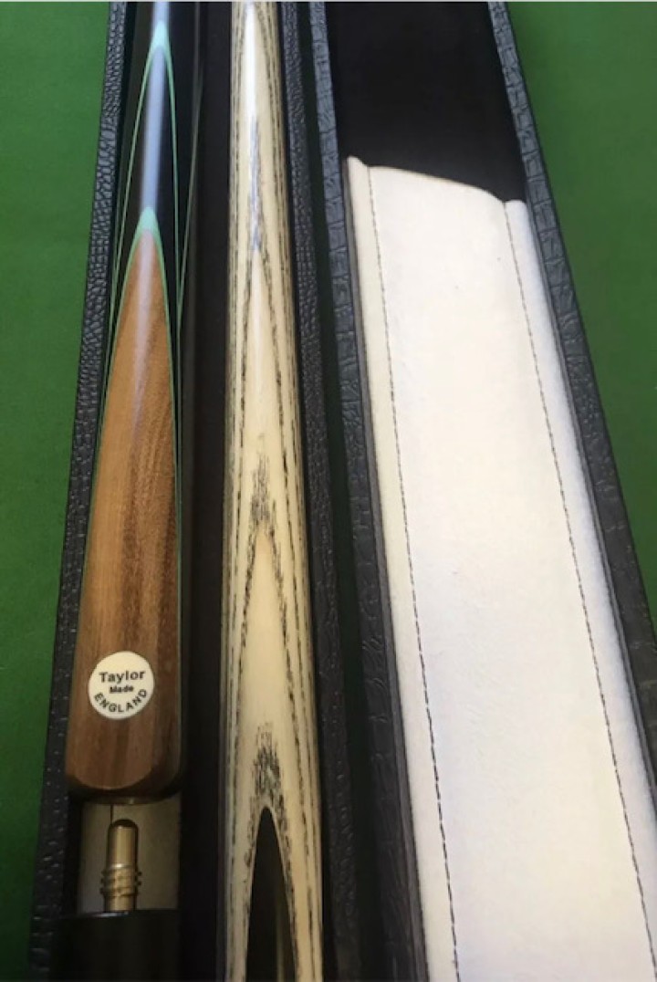 A nice subtle attractive looking cue design, this Taylor made snooker cue is 3/4 cut and comes with a lovely cue case, short mini butt and longer Tele cue extention.