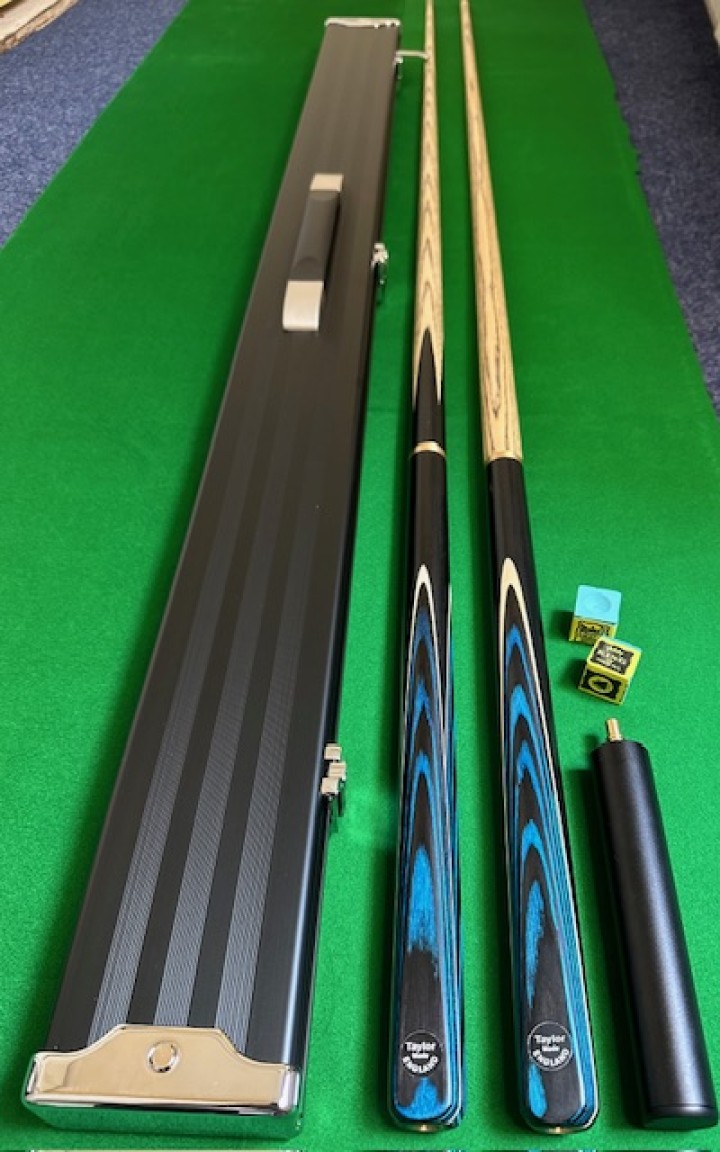 Taylor made english 8 ball pool cue package deal, includes both playing cue and break cue plus a lovely wide black aluminium cue case with chrome ends and slimline design looks fantastic. The set also comes complete with 6" mini butt and two chalks.